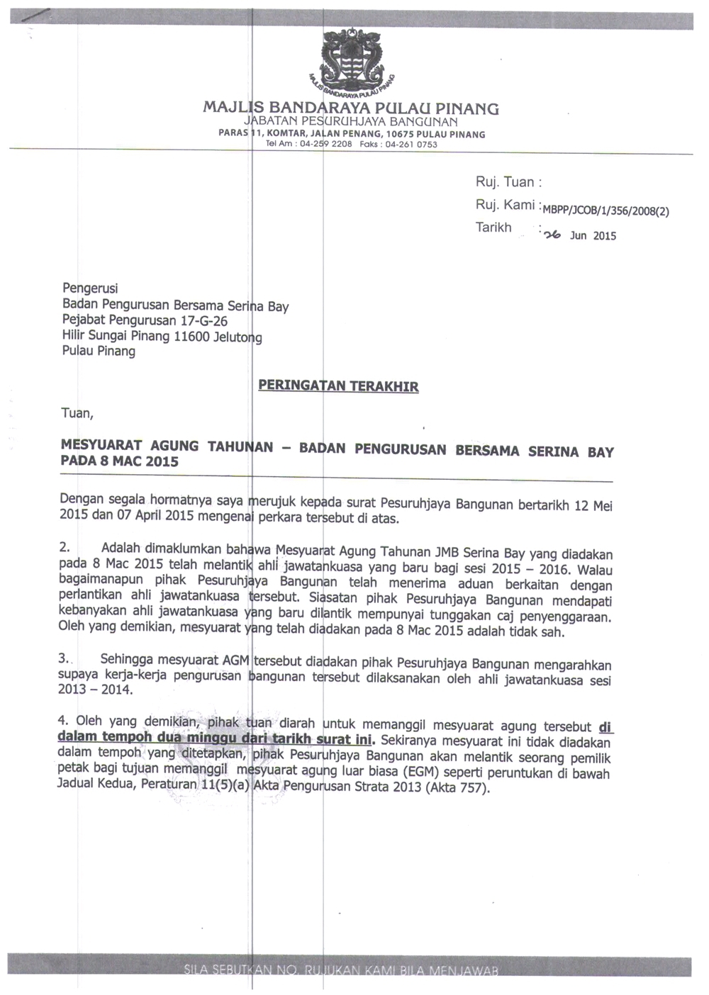 Serina Bay Apartment Penang Residence Complaint Final Reminder Letter By Cob Komtar To Serinabay 2013 2014 Jmb Chairman