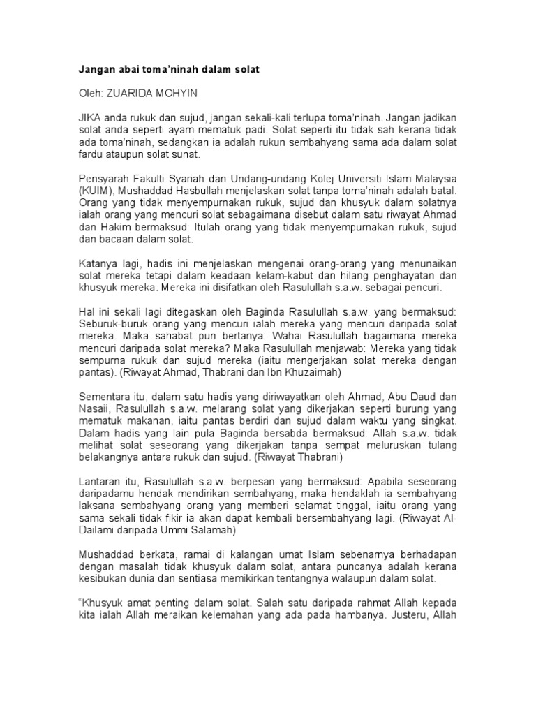Jangan Abai Toma Ninah Dalam Solat