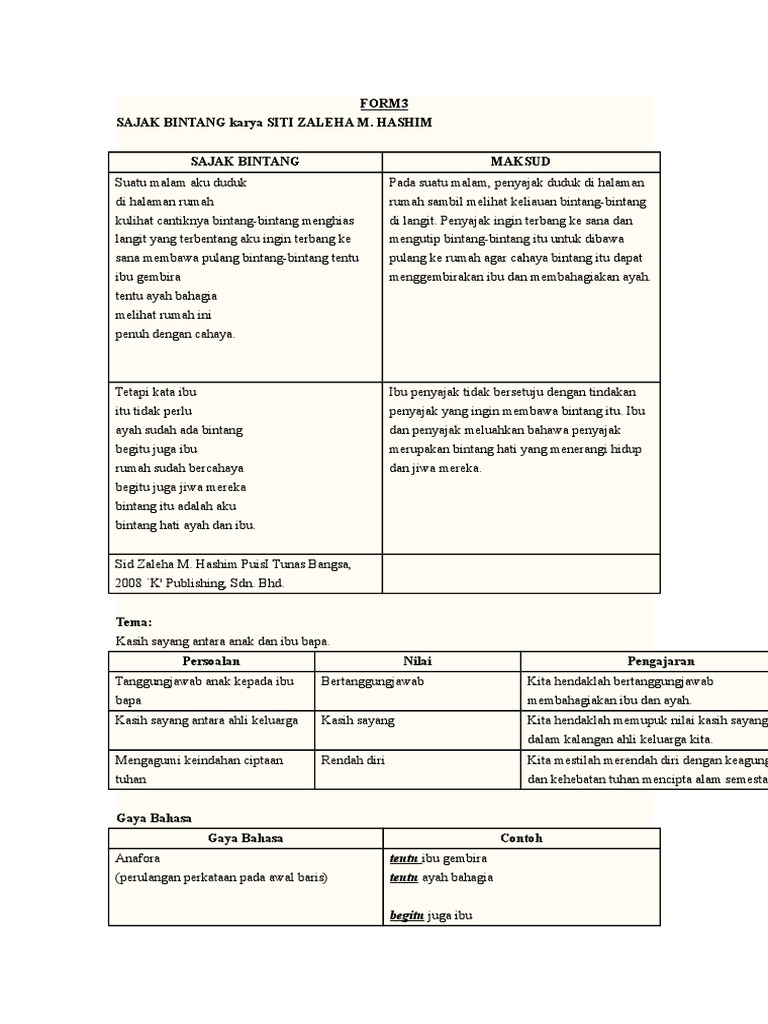 Form3 Sajak Bintang Karya Siti Zaleha M Hashim Sajak Bintang Maksud