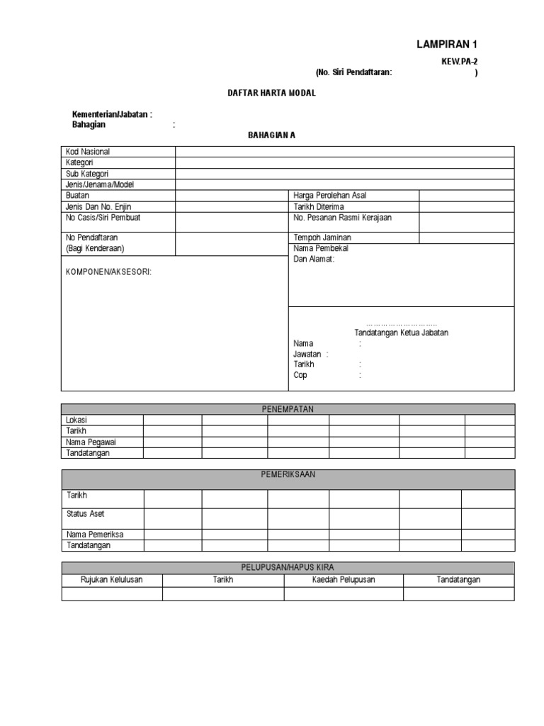 Borang permohonan pergerakan pinjaman aset alih nama pemohon. Pekeliling perbendaharaan malaysia am 2 4 lampiran b nota. Kew pa 9 borang aduan kerosakan aset alih kerajaan bahagian i untuk diisi oleh pegawai aset 1. Kew pa 9 borang aduan kerosakan aset alih kerajaan 28 kew pa 10 laporan pemeriksaan harta modal 29 kew pa 11 laporan pemeriksaan inventori 30 kew pa 12 sijil tahunan pemeriksaan harta modal dan inventori 31 bab d penyelenggaraan 19 22 32 kew pa 13 senarai aset yang memerlukan.