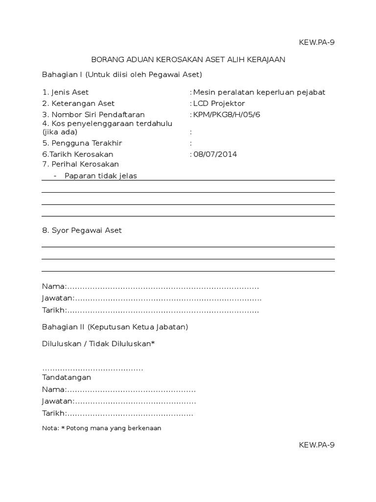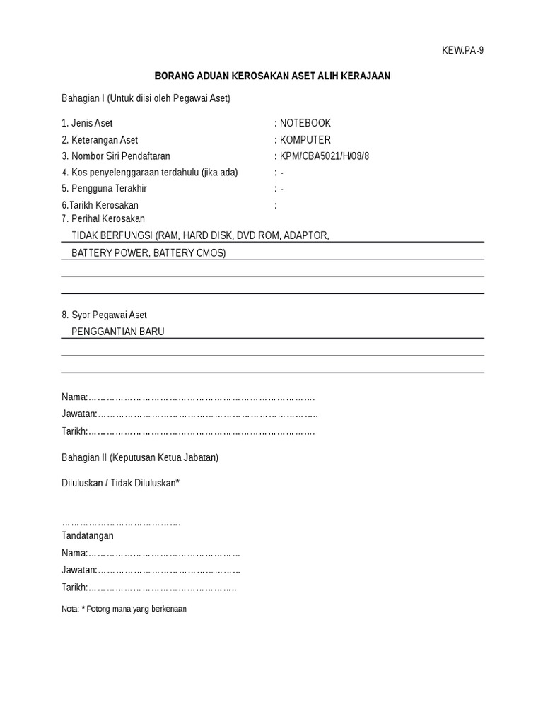 Kew pa 9 borang aduan kerosakan aset alih kerajaan bahagian i untuk diisi oleh pegawai aset 1.
