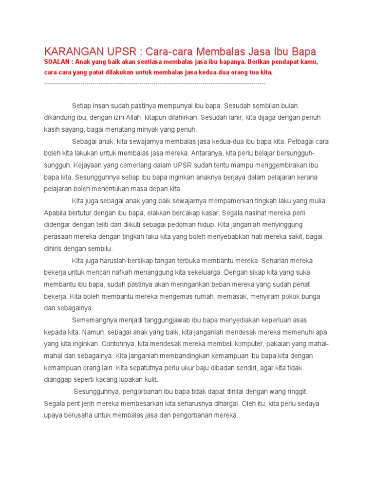 Karangan Upsr Cara Cara Membalas Jasa Ibu Bapa Soalan