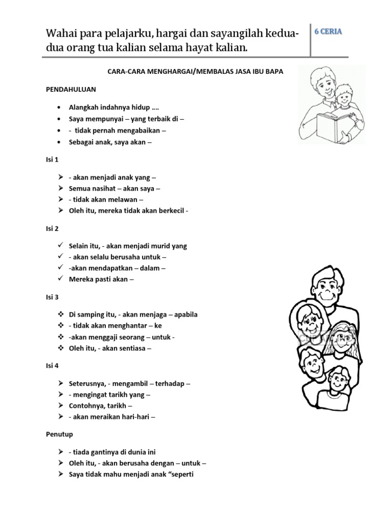 Tuliskan sebuah karangan tentang cara cara membalas jasa ibu bapa. Sejak dilahirkan lagi kita dijaga oleh ibu dan bapa dengan penuh kasih sayang bagai menatang minyak yang penuh. Sesudah sembilan bulan dikandung ibu dengan izin allah kitapun dilahirkan. Mereka akan teruja dengan keprihatinan anda mengajarkan dan mengingatkan mereka akan alam akhirat.