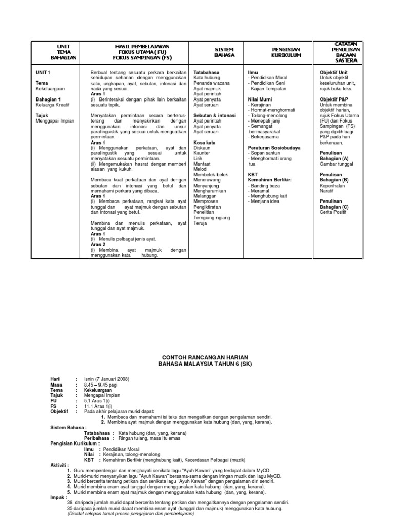 Unit Tema Bahagian Hasil Pembelajaran Fokus Utama Fu Fokus Sampingan Fs Sistem Bahasa Pengisian Kurikulum Catatan Penulisan Bacaan Sastera