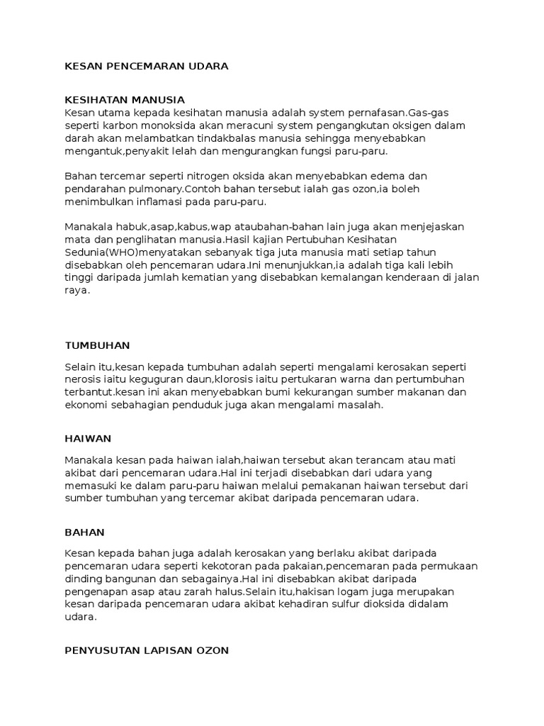 Di sini saya akan menerangkan secara terperinci berkenaan kesan pencemaran udara kesan utama pencemaran udara adalah menjejaskan kesihatan manusia tumbuhan haiwan penipisan lapisan ozon hujan asid pemanasan global. Mengetahui tentang konsep pencemaran alam sekitar. Sila huraikan contoh isi penting di bawah dengan ayat sendiri tajuk. Contoh d langkah 20 markah idea kreatif dan kritis cadangan relevan dan huraian sangat tepat rasionalhasil tugasan calon tidak kurang daripada 300 perkataan.