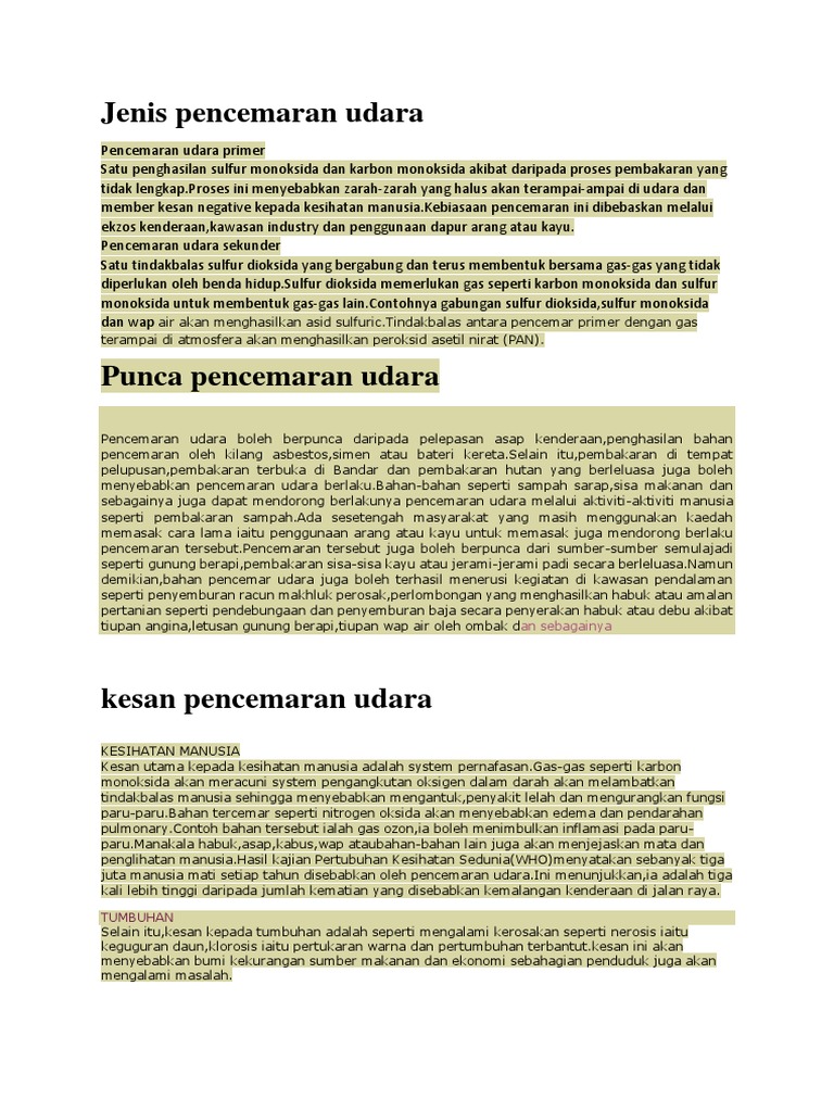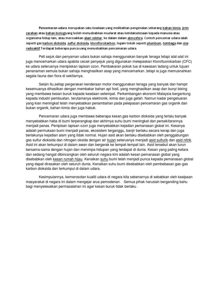 Masalah pencemaran udara merupakan masalah utama bagi penduduk di kampung hiliran hal ini kerana banyak aktiviti yang menyumbang kepada pencemaran seperti kenderaan yang lalu lalang di kampung saya selain itu pencemaran udara juga berpunca daripada pembakaran terbuka yang sering berlaku di. Saya telah menggunakan beberapa kaedah untuk mendapatkan maklumat dan seterusnya menyiapkan laporan kajian kes pencemaran udara di paka ini. Contoh karangan kesan pencemaran udara tugasan geografi pt3. Pencemaran udara bermaksud satu keadaan yang melibatkan bahan kimia jirim zarahan yang terkandung dalam udara sehingga berlakunya perubahan dan ketidakselesaan bahan bahan tersebut terampai di udara dan memberi kesan negative kepada manusia tumbuhan dan haiwan bahan bahan ini akan memasuki kedalam tubuh manusia melalui pernafasan dan berupaya menyekat pengaliran oksigen ke dalam salur salur darah.