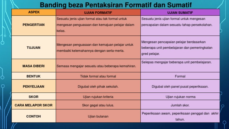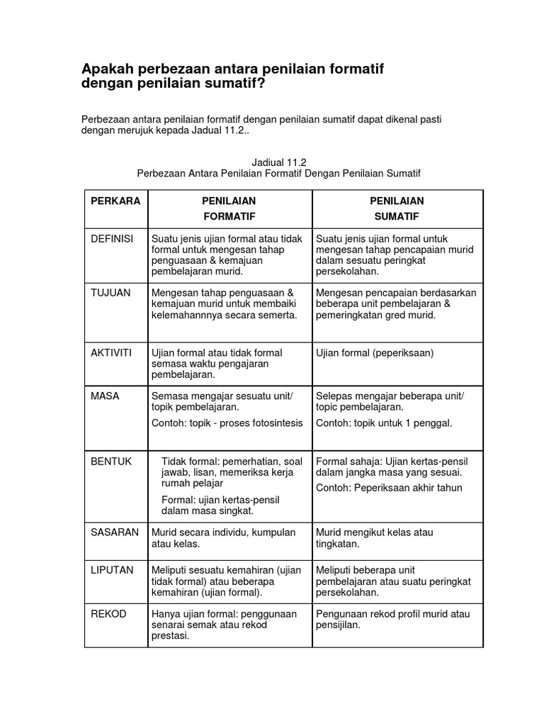 Jadual berikut menjelaskan ciri ciri perbezaan antara kedua dua jenis penilaian tersebut. Penilaian formatif dan penilaian sumatif mempunyai beberapa ciri ciri perbezaan yang boleh dilihat dari pelbagai aspek iaitu konsep tujuan aktiviti masa bentuk sasaran liputan rekod dan tindakan. Tq admin 4 information sgt membantu. Umumnya frekuensi tes formatif ini berkisar antara 2 4 kali dalam satu semester.