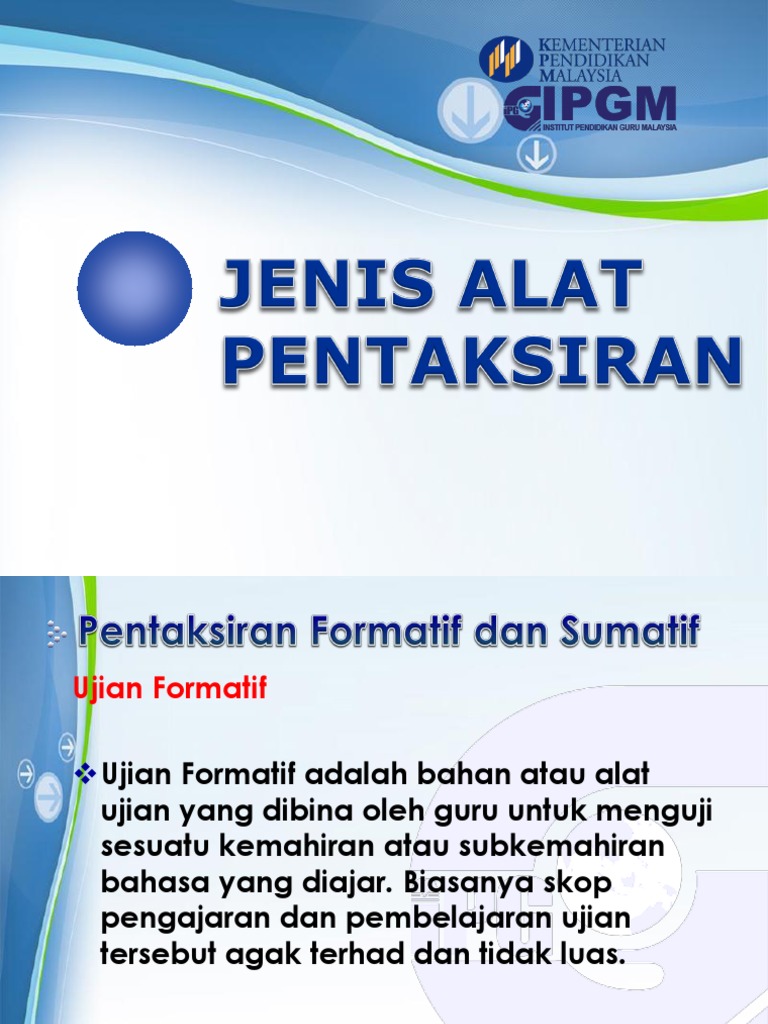 Contoh pentaksiran formatif dan sumatif. Perbezaan penilaian formatif dan penilaian sumatif. Contoh contoh penilaian formatif ialah seperti lembaran kerja dan ujian bulanan. Ujian yang boleh dibentuk dan ditadbir secara formal atau tidak formal bagi mengesan kemajuan atau penguasaan murid terhadap sesuatu pembelajaran. Contoh ujian sumatif ialah ujian pada peperiksaan upsr pmr spm dan stpm.