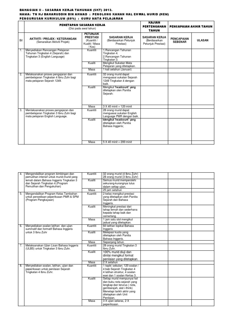 Bahagian Ii Sasaran Kerja Tahunan Skt 2013 Nama Tn Hj Baharuddin Bin Ahmad Penolong Kanan Hal Ehwal Murid Hem Pengurusan Kurikulum 60 Guru Mata Pelajaran