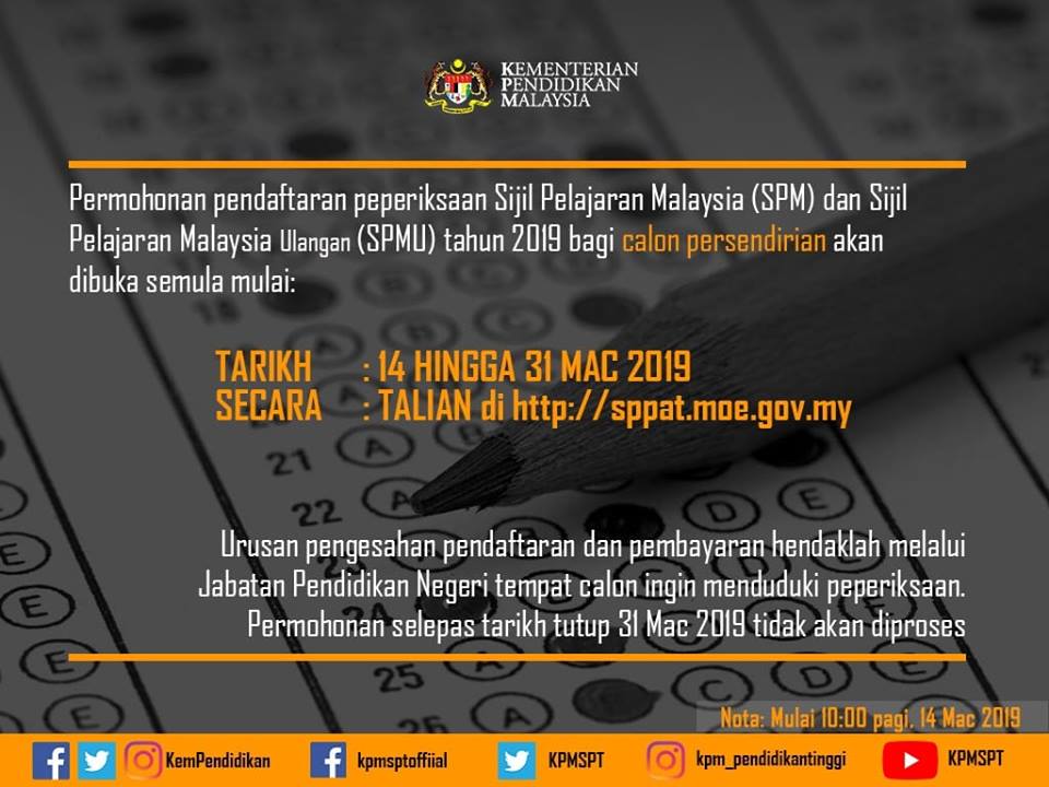 Pendaftaran Calon Persendirian Spm 2019 Dibuka Semula