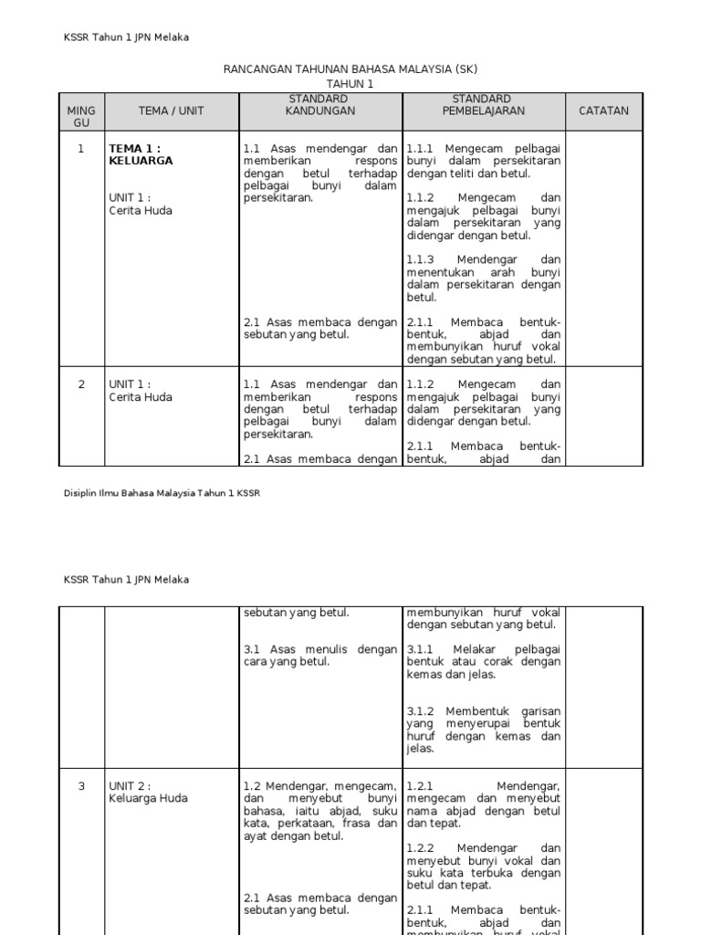 Rancangan Pengajaran Tahunan Bahasa Melayu Kssr Tahun 1 Sk