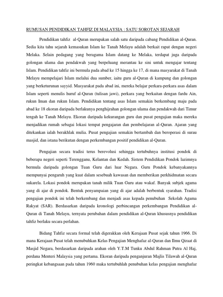 Pdf Pendidikan Tahfiz Di Malaysia Satu Sorotan Sejarah